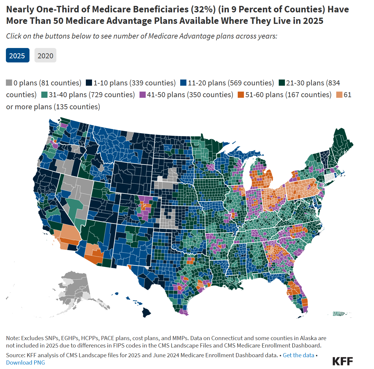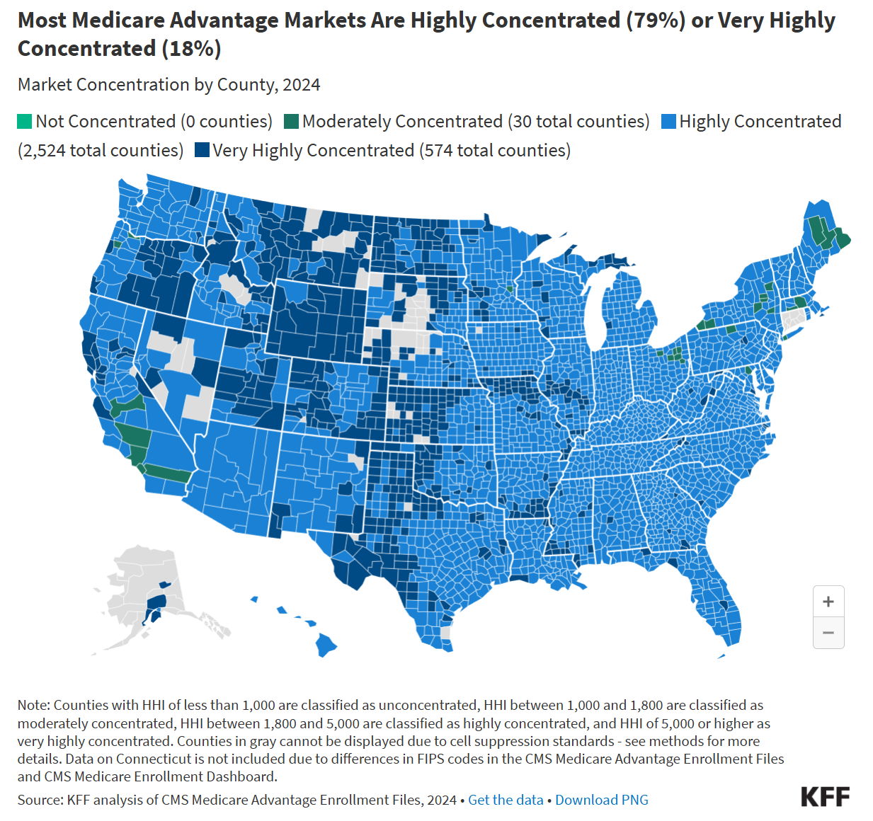 What competition? KFF published an Arnolds Venture funded report finding that 90% of beneficiaries live in counties where one or two insurers dominate, with UHC and Humana leading in two-thirds of markets. |