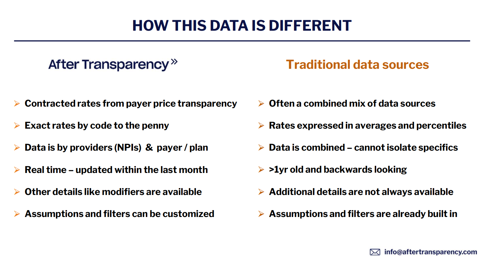 Like I've mentioned, over the past couple of years and more acutely over the past month of talking with the After Transparency crew (Jon, Pete, and the rest of the gang), it's become apparent to me how quiet and unknown the payor price transparency data capabilities are that continue to only get better over time. If you take away nothing else from this piece, I want you to remember this: you NEED to incorporate payor price transparency data - and its future iterations - into your future strategy planning in order to future proof your operations. And if you haven't already done so, After Transparency can help. Who better to work with than the team that is correcting the reported rates to help out their customers and regulatory bodies (and submitting those changes pro bono just because it's important for the industry and they're the team with the skills and data to back up their proposed changes)? Here are a few other differentiators for you guys to check out: |