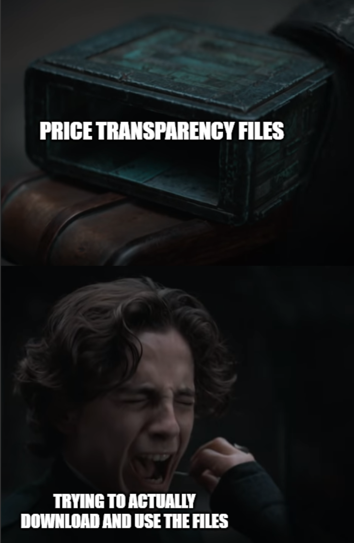 Classic healthcare, am I right? Abe had just stumbled across what would become the first of many headaches in dealing with the promise of payor price transparency data. Files were MASSIVE - way too big for normal computers and, really, way too big for normal databases. |