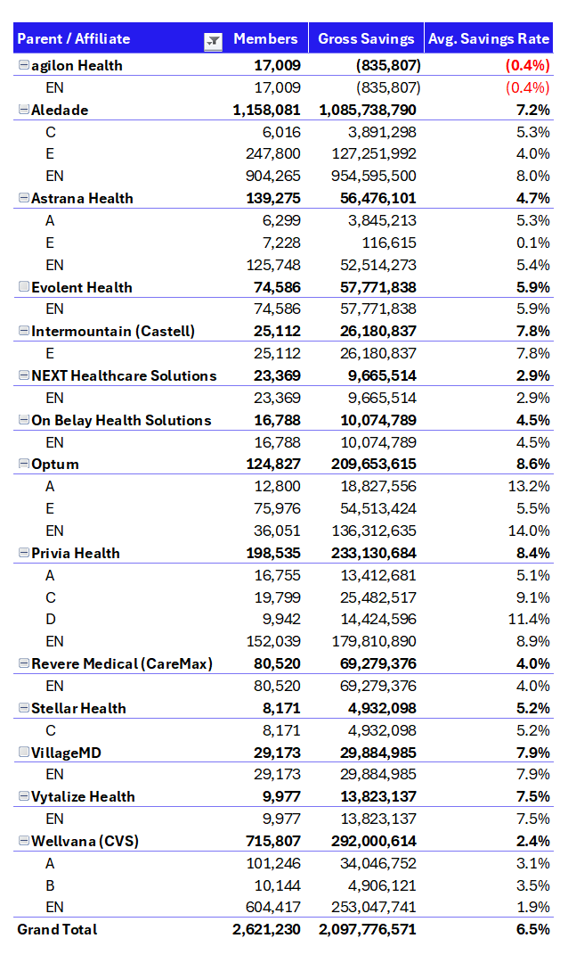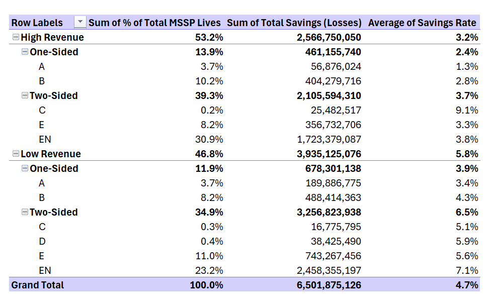Assuming I labeled all the ACOs correctly (which is a big assumption, so take it with a grain of salt) here are some of the notable enablers and their performances. Note that I pulled in acquired entities. So Wellvana will have all of CVS' MSSP portfolio, and Astrana with CHS, etc. It may not be perfect, but it is probably pretty close or directionally accurate. Also, notable that Aledade's total membership is 11.2% of all of MSSP, quietly, through nearly 60 ACOs in the program, and savings generated comprising nearly 17% of all gross savings within MSSP. | How else would you want to see the data sliced? There are so many ways to do it. Let me know your thoughts! |