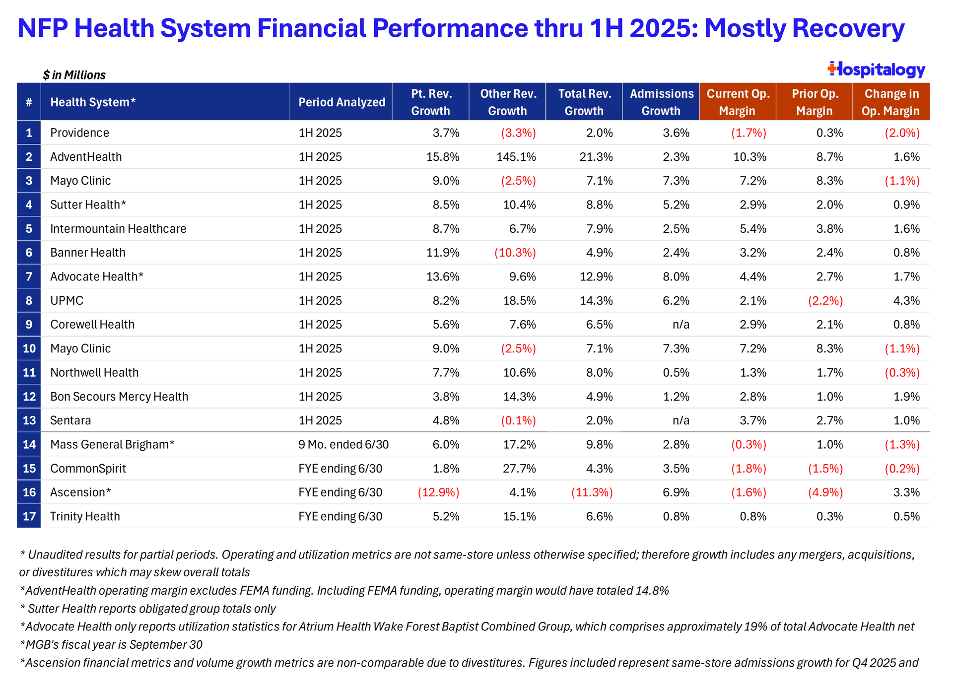 TL;DR: nonprofits are experiencing broad-based recovery so far in 1H 2025, marked by solid revenue growth (median rev growth being around 8%) and improving margins for most systems driven by the high utilization environment. However, the rebound remains uneven, with a clear divide between high-performing, diversified operators and those still constrained by cost, locked into regions with lots of consolidation, and ongoing payor dynamics. | Most health systems saw positive margin change in 1H 2025 with AdventHealth (including its $260M acquisition of ShorePoint from CHS), UPMC, and Ascension being standouts as the latter continues its transformation journey. Other notable players from a patient revenue growth standpoint include Banner Health and Advocate. |