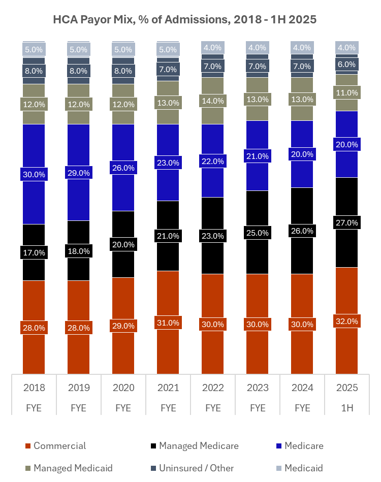 - MA admissions grew 4.8%, while Traditional Medicare grew just 0.9%. You can see this payor mix phenomenon happening across all hospitals. From 2018 to today, HCA's payor mix (as a % of admissions) went from 17% MA to 27% MA: