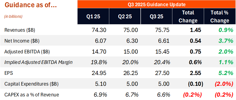 - The above table displays midpoint figures from each guidance update related to HCA's quarterly reports. Stemming from a strong payor mix, favorable updates in state supplemental programs, strong acuity, increasing volumes, and continued expense leverage, HCA has bumped up its guidance multiple times in 2025.