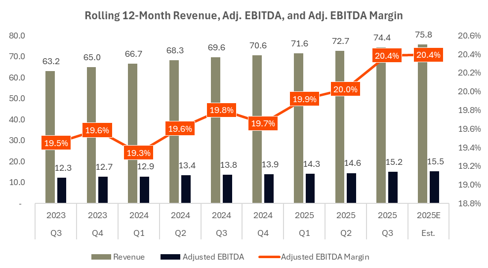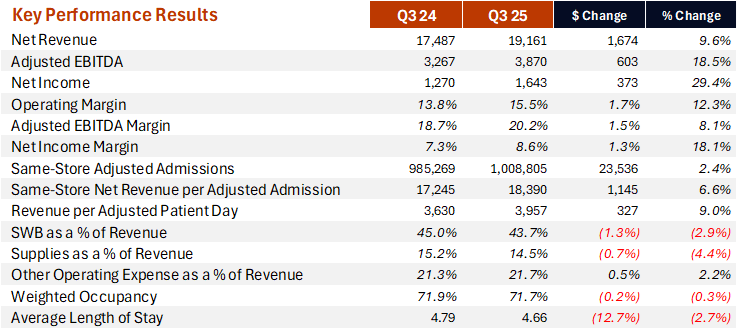- Adjusted EBITDA margin expanded to 20.2% in Q3 from about 18.7% in Q3 last year, supported by labor and supplies performance and the supplemental revenue tailwind.