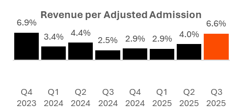 - Q3 revenue per equivalent admission up 6.1% year over year. Same‑facility revenue per equivalent admission up 6.6%. Inpatient revenue per admission up 6.3% reported and 7.1% same‑facility. Drivers were stronger payer mix, improved dispute resolution, consistent acuity, and higher Medicaid supplemental revenue. Same-store revenue per adjusted admission growth by quarter can be seen below. It's a pretty rich trend for HCA: