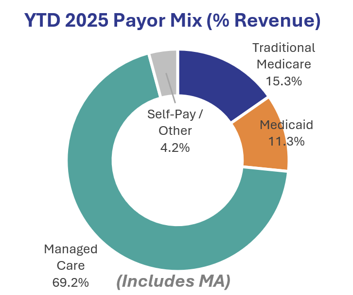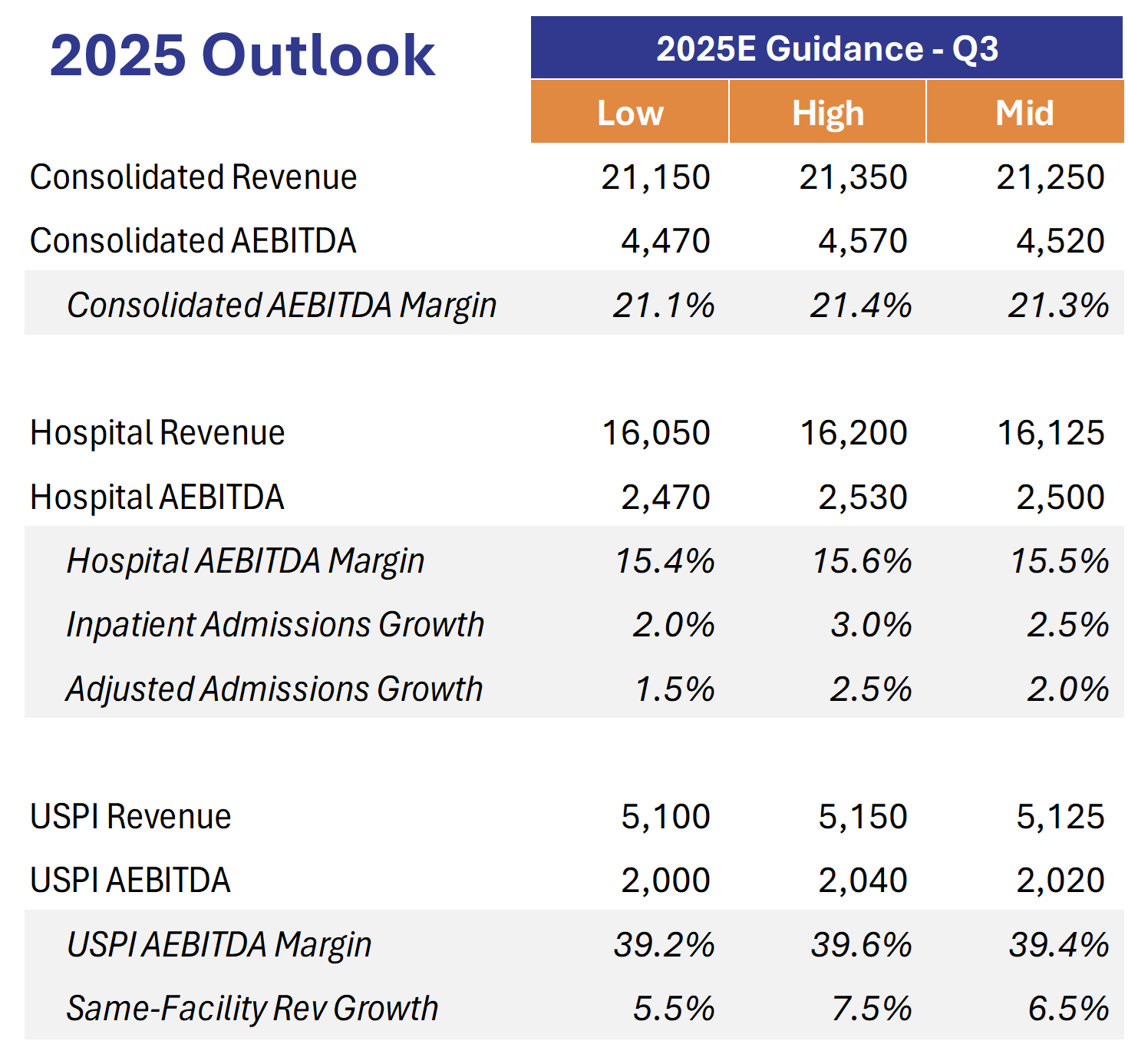 2025 guidance raised yet again as THC continues to crush this year. Drivers include sustained high acuity strategy, stable labor and cost discipline, and USPI growth from M&A and de-novos. 2026 watch items remain ACA exchange subsidy timing and pending approvals for state directed Medicaid payments; while USPI is less exposed to these dynamics. CMS prior auth begins in limited states, including Texas, with minimal expected disruption given documentation readiness. |