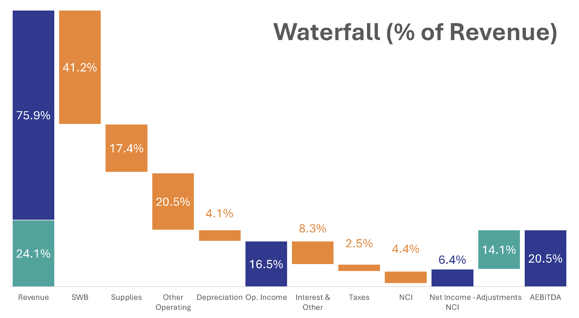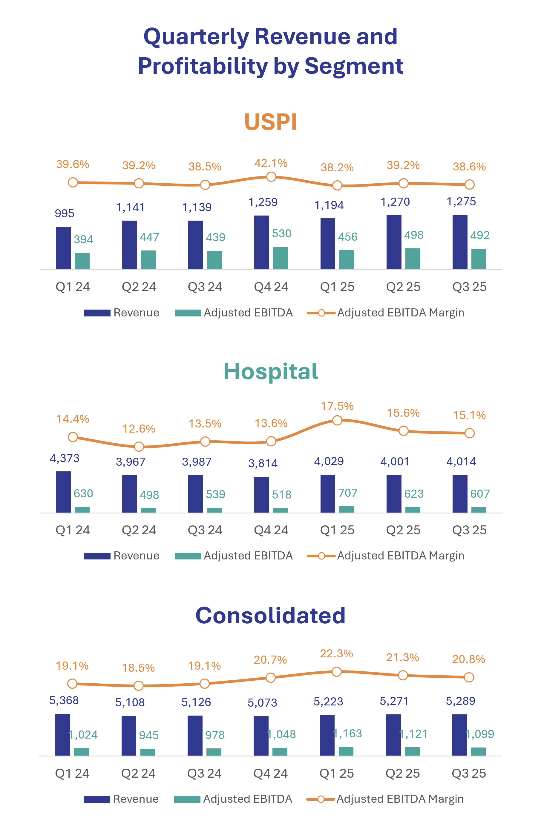AEBITDA margin 20.8% (+170 bps YoY). Hospitals delivered 15.1% (+160 bps; driven by acuity and payor mix) and USPI 38.6% (flat). SWB 41.7% of revenue (improved 160 bps YoY) with contract labor 1.9% of SWB (consistent with last quarter and an all-time low). Medicaid supplemental programs contributed $346M in Q3 including $38M from prior years; YTD $1.02B with $148M out of period, the largest normalization to watch into 2026. |