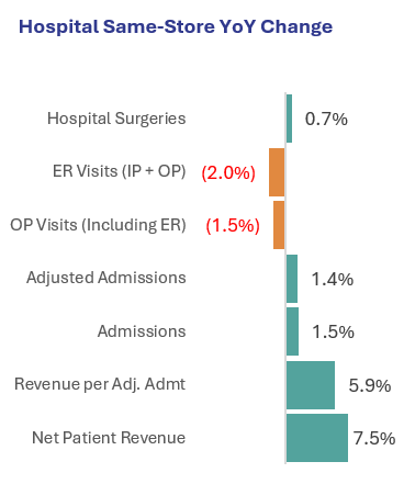 Volumes stayed healthy with mix and acuity (more on that in a sec) doing the work. Same store hospital adjusted admissions rose 1.4% and revenue per adjusted admission climbed 5.9% on higher acuity and payer mix. USPI posted same facility revenue +8.3% on net revenue per case +6.1% and cases +2.1%; total joints +11%. Ortho, spine, and robotics were callouts on the call and remained strong; GI recovered late in the quarter. Outpatient respiratory and infectious disease trends were lighter than expected, likely a later season start (flu season, sadly, drives up volumes). Capacity planning is in place for the typical fourth quarter run. |