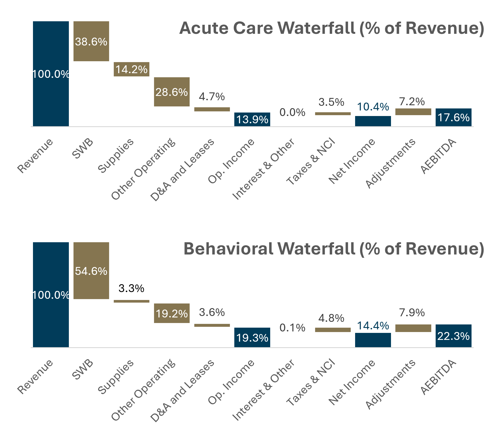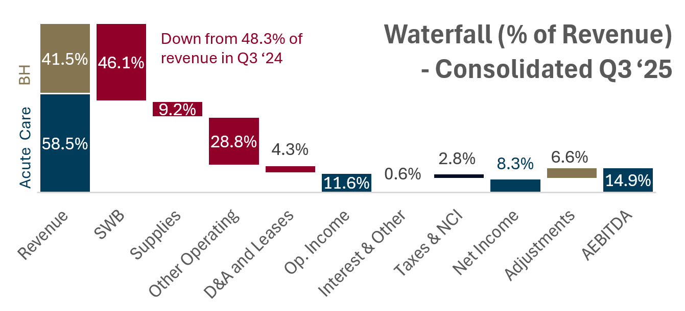 Margins improved materially in Q3. UHS posted a 15.8% same-facility acute care EBITDA margin, up 190 basis points year over year, putting it roughly on par with Tenet's hospital segment. The drivers were clear: higher acuity, disciplined expense control, and better labor productivity in acute operations. Behavioral margins were stable but constrained by wage inflation and underutilized capacity. Labor scarcity remains the single largest operating cost headwind. Professional fees — particularly in anesthesia and radiology — are inflating at double-digit rates, echoing concerns raised by HCA and others. | The broader takeaway: UHS is expanding margin where it can (acute) and holding ground where it must (behavioral). Its low leverage and strong balance sheet allow it to absorb temporary inefficiencies without the existential stress smaller operators face. Management continues to flag Medicaid supplemental cuts as a 2026–2032 overhang, but offsetting programs in Florida and Nevada could add $75–80 million in relief next year. |