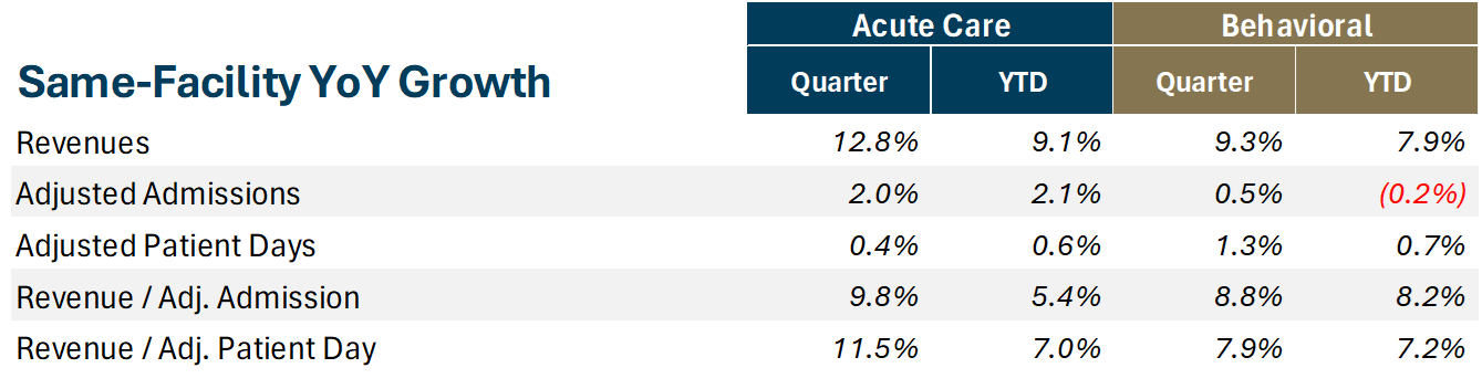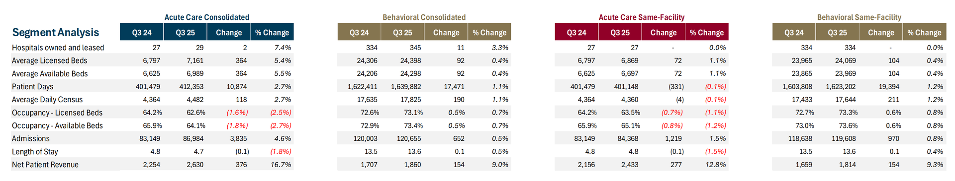 Mixed volume performance in Q3: Acute care trends were solid, with surgical growth described as "relatively across the board," and cardiac services singled out as particularly strong. Management avoided market-level disclosure but confirmed that major metros — including Las Vegas and Florida markets — performed above expectations. In behavioral health, adjusted patient days grew just 1.3%, well below the company's long-term 2–3% target. Filton attributed the shortfall to labor shortages at roughly a quarter of its facilities, limiting the ability to admit and treat despite clear underlying demand. Utilization remains high nationally, but UHS isn't fully capturing that demand given staffing and managed care constraints. Patient acuity in the acute segment appears stable to slightly higher, aligning with peer commentary across HCA and Tenet. Behavioral acuity levels are high as well, though length-of-stay compression from payer management continues to dampen volume growth even when demand rises. Taken together, UHS's utilization trends present an interesting paradox: the company has the right demand drivers but the wrong constraints and therefore is unable to fully monetize its volume potential until the workforce situation eases. |