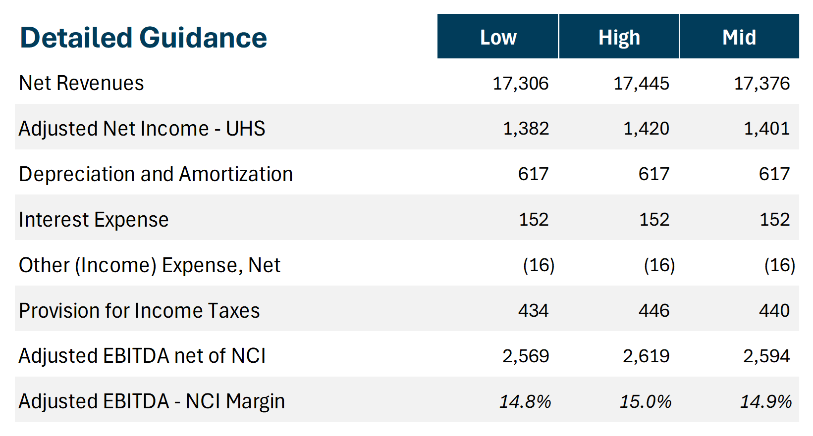 UHS execs reaffirmed the 5–6% acute and 6–7% behavioral revenue growth goals with cost growth around 4%, implying ongoing margin expansion. For 2026, key factors shaping the outlook include: - Supplemental Medicaid declines beginning, though mitigated by new programs in select states;
