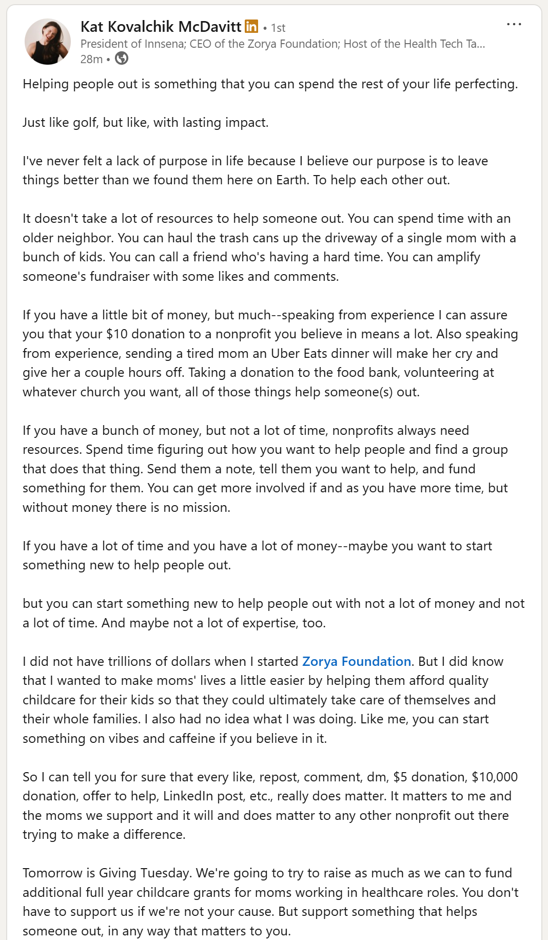 The Zorya Foundation is building a brighter, more equitable future for women in healthcare—and you can be part of that story. Let's rally together this week and show what the healthcare business community can do when we support the people at the heart of the industry. Visit Zorya Foundation's website to learn more and make your Giving Tuesday count. Even if you can't give, boost Zorya's voice by following them on social media: And finally, here is a message from Zorya Foudation Founder Kat McDavitt: Hello, Zorya Foundation supporters! Our goal for Giving Tuesday is simple this year: take as many moms off our waitlist as possible. Thanks to all of you, we raised enough at the end of summer to be able to fund six more full year childcare grants for healthcare workers (special thanks to Kary Nulish of Castlemark Consulting, Michael Meucci and Innsena for sponsoring four of these six grants! We had an overwhelming response to our call for applicants for this cohort. All of the moms who applied are so deserving. Most are single moms with multiple children and most are pursuing education to advance in their careers. We're going to try to help as many more as possible. Each full-year grant is $12,000. I'm throwing in for an additional full grant and we have a healthy head start toward our next one from Dr. Ben Zaniello, Nora Cox, Mandira Singh and...my own mama, who always flew down to Atlanta at a moment's notice so I could travel for work and know my boys were loved and happy (she still does!). So many of you donate year after year. We couldn't do any of this without you. Giving Tuesday is a busy day and there are many worthy causes. But if you'd like to support us in today's goal by donating again to help us give more moms in healthcare the gift of a childcare grant, we would be so grateful for your support. Any amount, no matter how small, makes a difference. You can donate here: https://donorbox.org/giving-tuesday-2025-full-year (if you are planning to send via a DAF, please let us know and we'll include you in the total!) I'll leave you with a note from one of our first full-year grantees--which wrapped a couple of months ago. You all are doing amazing things for healthcare workers and their families. "Because of Zorya Foundation's full-year childcare grant, I was able to focus on my studies and successfully pass my TEAS exam for nursing while working full time as a medical assistant. I was then accepted into a nursing program, a huge step toward my career goals. As a single parent of two children, without this grant I wouldn't have been able to even focus on such a thing. This grant allowed me to get as far as I have in pursuing my career. I am truly grateful for your support." Thank you for supporting the Zorya Foundation. It's an honor of a lifetime to have your support to do this work. Kat McDavitt CEO & Founder Zorya Foundation |