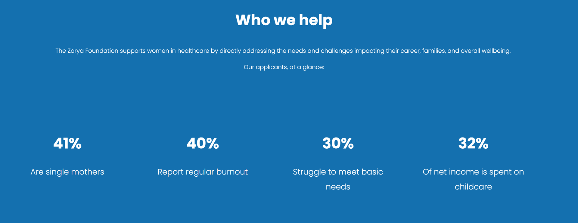 This Giving Tuesday, let's talk about something close to mine and all of our hearts - the women who make healthcare work. Women represent nearly 80% of the healthcare workforce. They're the ones grinding on a day to day basis balancing caregiving responsibilities and often burning out while keeping our healthcare systems running smoothly. Some of my wife's closest friends are social workers, nurses, nutritionists, doctors, and therapists. Oh, and she's a speech therapist, too. Doing her job part time while raising our son over the past year has been daunting enough. That was with incredible grandparent support. But if you're a woman in healthcare without the level of support we were fortunate to have, let's just say I have a newfound level of respect - I don't know how you do it. Of course, Zorya Foundation's work goes beyond mothers. Their mission is simple: Support Women in Healthcare. And how they show support is simple, too: provide cash grants to women who work in healthcare and are struggling, plain and simple. Zorya finds women to support through an application process, and so far they've helped support women across a variety of healthcare roles: - Registered nurses;