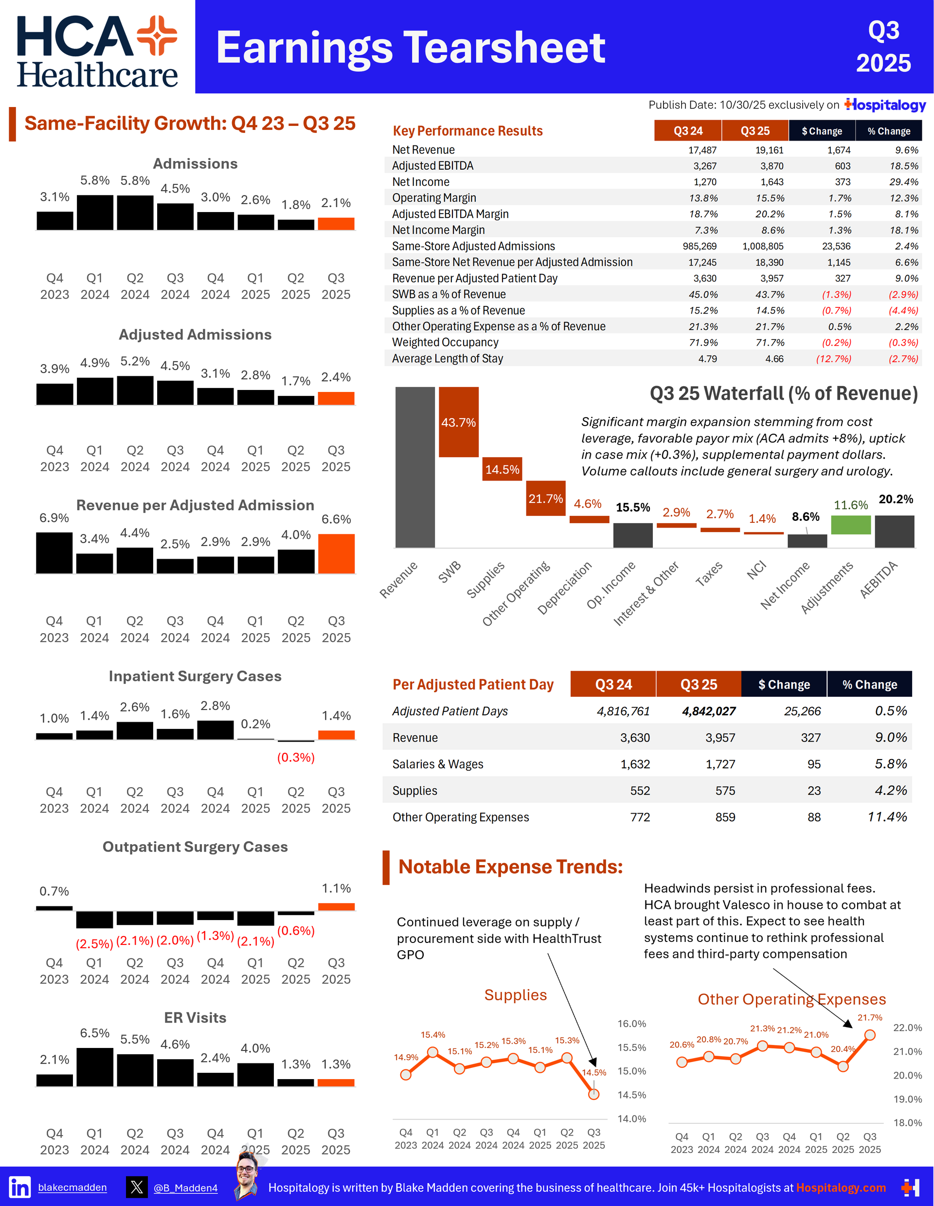 Volume + Utilization: Another quarter of broad-based growth. OP surgeries down (from Medicaid/Uninsured), but revenue increased 5% (acuity & payor mix grew 7% to counteract the decline). HCA specifically called out cardiac procedures, rehab, and obstetrics in prepared remarks on the earnings call itself. Medicare vs. MA: Same-facility Medicare admissions grew 5.3%. Traditional Medicare was flat. MA admissionsgrew11%inQ3; HCA attributed 2% of this growth to the 2-Midnight Rule. Same-facility adjusted admissions declined 8.5% in Medicaid, increased ~4% in commercial, and increased 43% in exchange. Uninsured adjusted admissions increased +7.2%. Revenue + Payor Mix: 7.1% = Same-facility revenue growth. 7.9% overall revenue growth. 'Modest' benefit from Medicaid supplemental payment programs. TOO MANY DENIALS: Point of emphasis for all hospitals in 2024. HCA has seen ramp-up in payor denial activity but didn't see a $$$ impact. Still, HCA observed a few large MA players driving the most denials. MA patients have higher LOS (around 10% higher) even adjusting for acuity. HCA blamed but is working with payors on this inefficient dynamic. Expenses + Margin: 0.9% increase in adj. EBITDA from improved labor (down 1.6% as a % of revenue) and contract labor (4.6% of total labor spend, down 18% over 2023). 2.5% - 3.5% wage increases for 2025. Supplies & other operating expenses squeezed revenues a bit. HCA sees opportunity with AI (immature today) and other investments to improve admin functions. It recently announced an expanded partnership with Commure to deploy ambient AI system-wide. Capital Allocation + CAPEX: ~$1.2B in CAPEX in the quarter. ~$1.8B in share repurchases and ~$170M in dividends distributed. HCA plans to have added 600 IP beds and 100 new OP facilities by the end of 2024. $6B in capital projects under development. 2,600 sites of care by the end of 2024. Outlook + Guidance: HCA thinks elevated volume growth will continue at 3% - 4% while reimbursement will increase 2% - 3%, resulting in growth 'near or slightly above' long-term HCA targets in 2025. $50M or $0.15/share lost estimate from hurricanes in Q3. Exchange growth will moderate in 2025 to 8% - 10% vs. 30% in 2024. My Take: While we may have reached peak 'hospital multiple' HCA continues to benefit from a strong & stable operating environment entering 2025 in its markets: broad-based growth with 'very few challenges.' Expect HCA to continue to win IP market share over less efficient competitors as it drives toward having 13 access points per hospitals in its markets. |