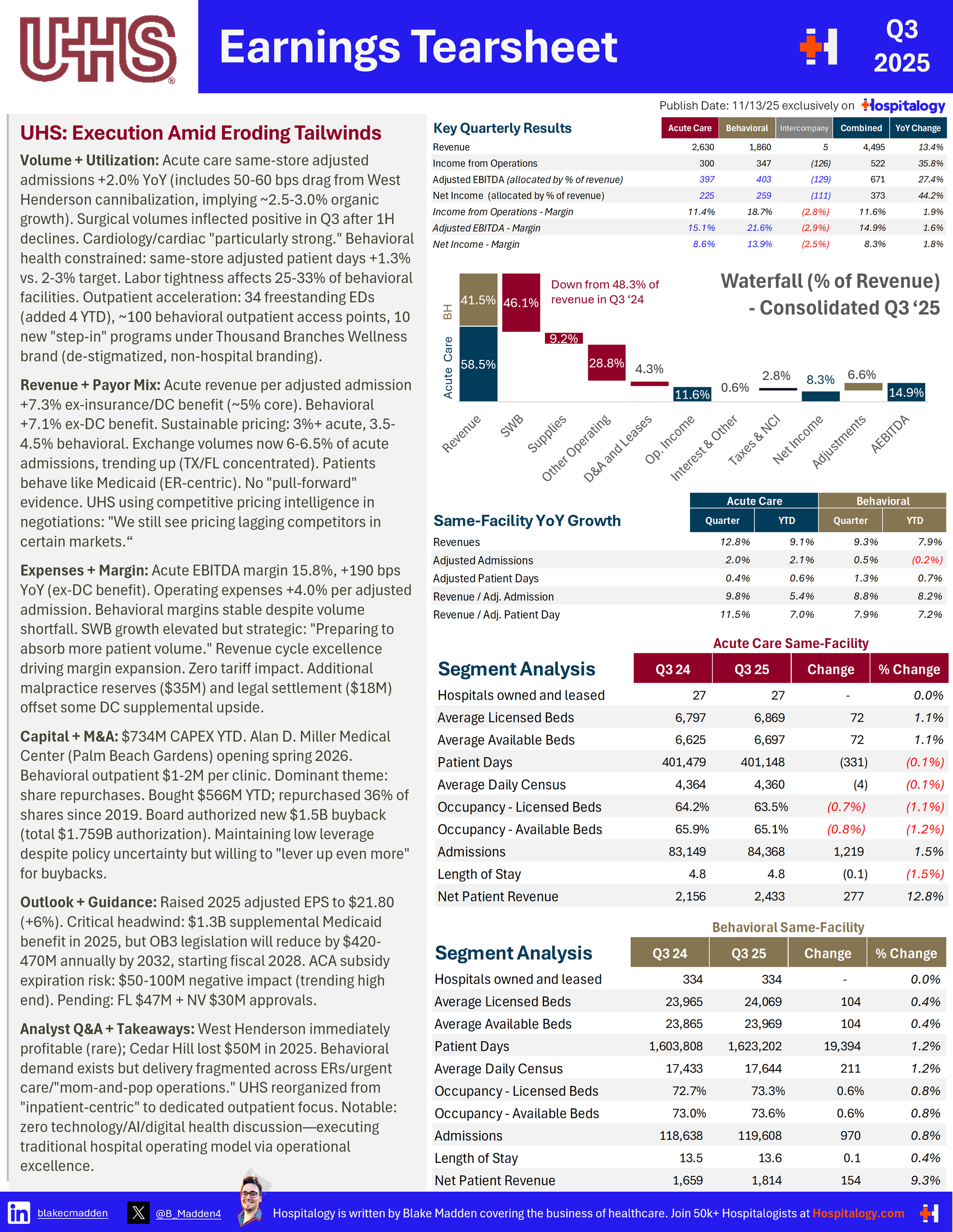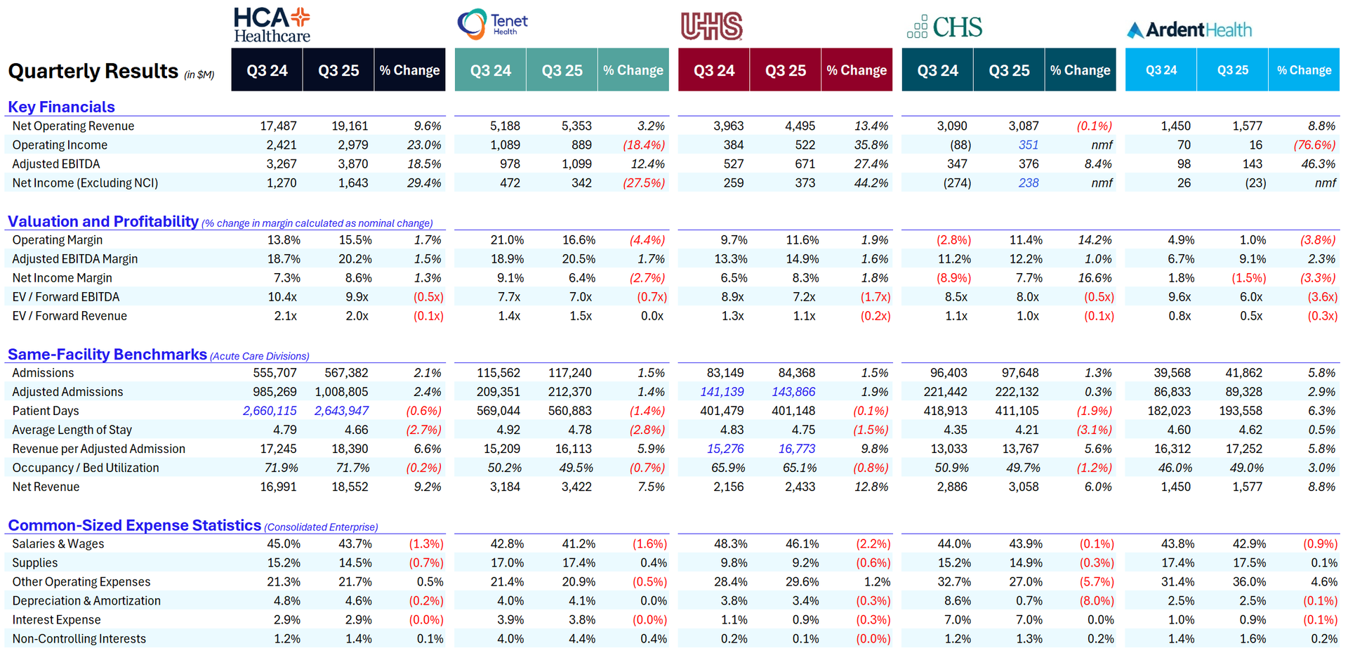 - Capital deployment focused on organic growth and shareholder returns: In an environment of policy uncertainty and limited M&A opportunities, all operators prioritized share repurchases, organic growth investments, and balance sheet management. HCA repurchased $2.5 billion in Q3 alone, while Tenet repurchased $93 million, and UHS received a new $1.5 billion authorization.