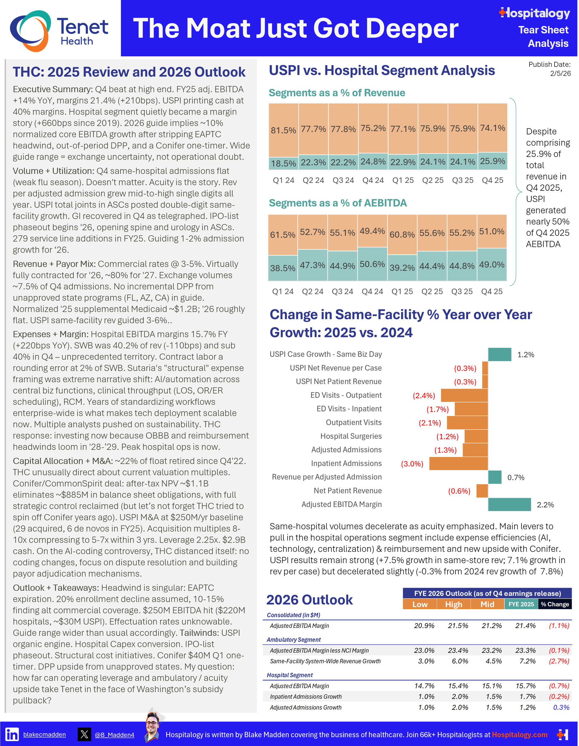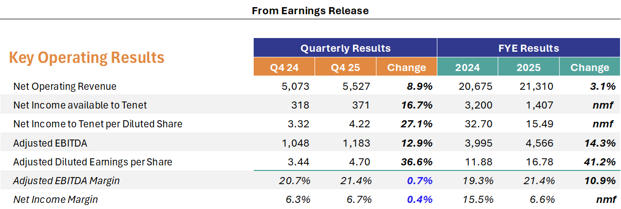 Happy Thursday, Hospitalogists! Tenet reported Q4 earnings this week, and if you've been following the multi-year transformation story here, Q4 was another chapter in what's becoming one of the most compelling operational turnarounds in the hospital sector over the past several years. If HCA is 1a, Tenet is 1b and actively investing in a key growth vector in healthcare: outpatient migration.