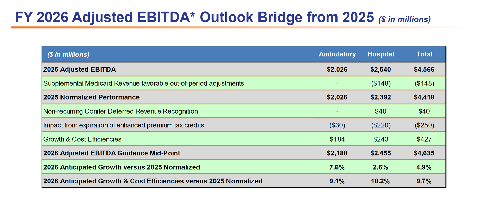 Headwinds include supplemental payments timing and ACA subsidy expiry. Tenet assumes a 20% reduction in ACA exchange enrollment (exposure in AZ, MI, CA), with only 10-15% of those individuals finding alternative coverage (commercial). The $250M hit is split $220M hospitals / $30M USPI. The below slide was helpful to digest both the 2025 adjusted baseline (without Medicaid supp pmts) and walkthrough to 2026 adjusted EBITDA. After normalizing for $148M of out-of-period supplemental Medicaid and the $40M Conifer deferred revenue recognition, core EBITDA growth is expected at ~10% at the midpoint.
