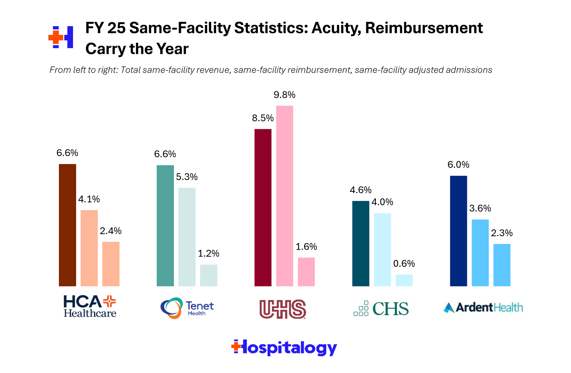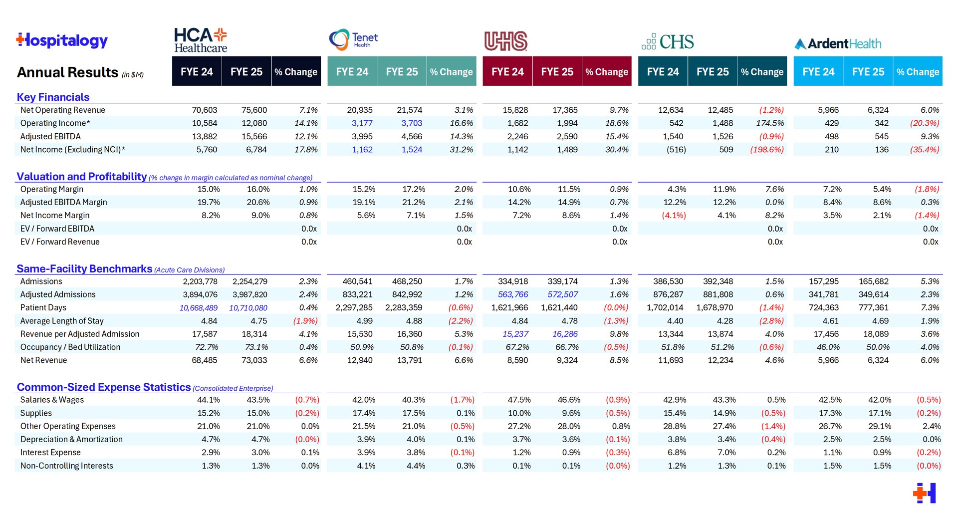 - Readying the warships before upcoming cuts: The public operators are bolstering up their margin defense (cost reductions, centralized planning) ahead of looming cuts in the years to come, and the ones with standardized tech stacks (Ardent's single-instance Epic, HCA's data platform) hold a structural advantage.