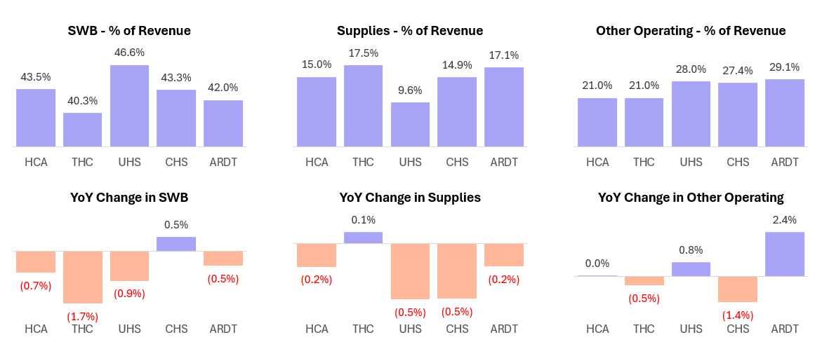 Cost Pressures and Operating Leverage Where hospitals are winning: Contract labor is at or near post-pandemic lows across the board. Supply chain management is well controlled. SWB as a percentage of revenue is declining at most operators. These are the categories where standardization, scale, and technology investments are delivering clear operating leverage. |