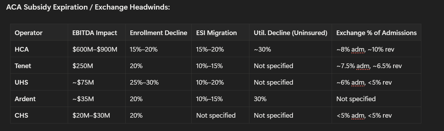 Executive Summary - Everyone bracing for ACA impact, and we finally get some numbers: HCA sized the exchange headwind at $600M–$900M to EBITDA while CHS estimated just $20M–$30M. Common assumptions include enrollment declines of 15% - 30%, conversion rates to commercial insurance of ~10% to 20%, and volume declines of ~30% for newly uninsured.