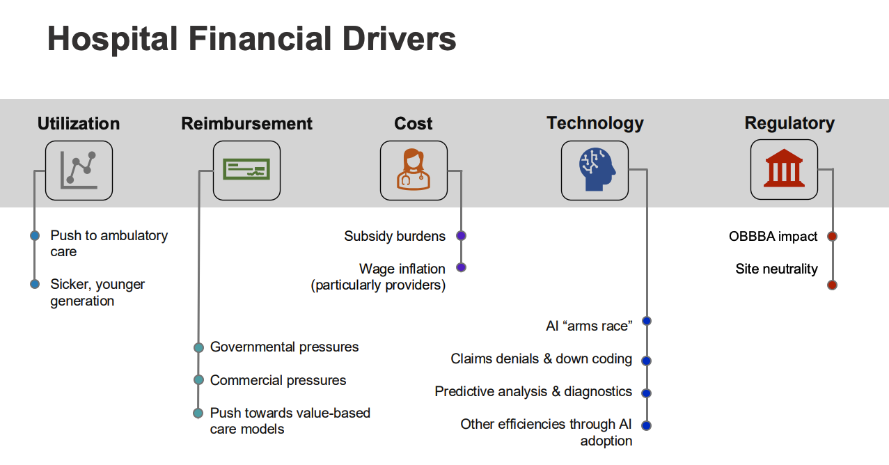 I hosted a community roundtable this week with Herd Midkiff and Kyle Kirkpatrick, both partners at JTaylor, a Fort Worth based consulting firm that works on valuation and transaction matters across the hospital sector. Herd and a colleague recently gave a presentation at the ACHE Congress on the current state of healthcare finance. They skinnied it down for our group, and the discussion that followed was too good not to write up. The full presentation deck is uploaded to the Hospitalogy community content library if you want to dig into the slides yourself. But here's my take on the big themes, plus some of the back and forth from the group. The through line across everything Herd and Kyle presented is one you already feel if you're running a hospital right now: the traditional margin model is under pressure from basically every direction simultaneously. Payor mix deterioration. Physician subsidy inflation. An AI arms race between providers and payors. OBBBA fallout. Site neutrality creep. And a widening bifurcation between the haves and have nots in the hospital world. Let me walk through it. (Download the slides here) |