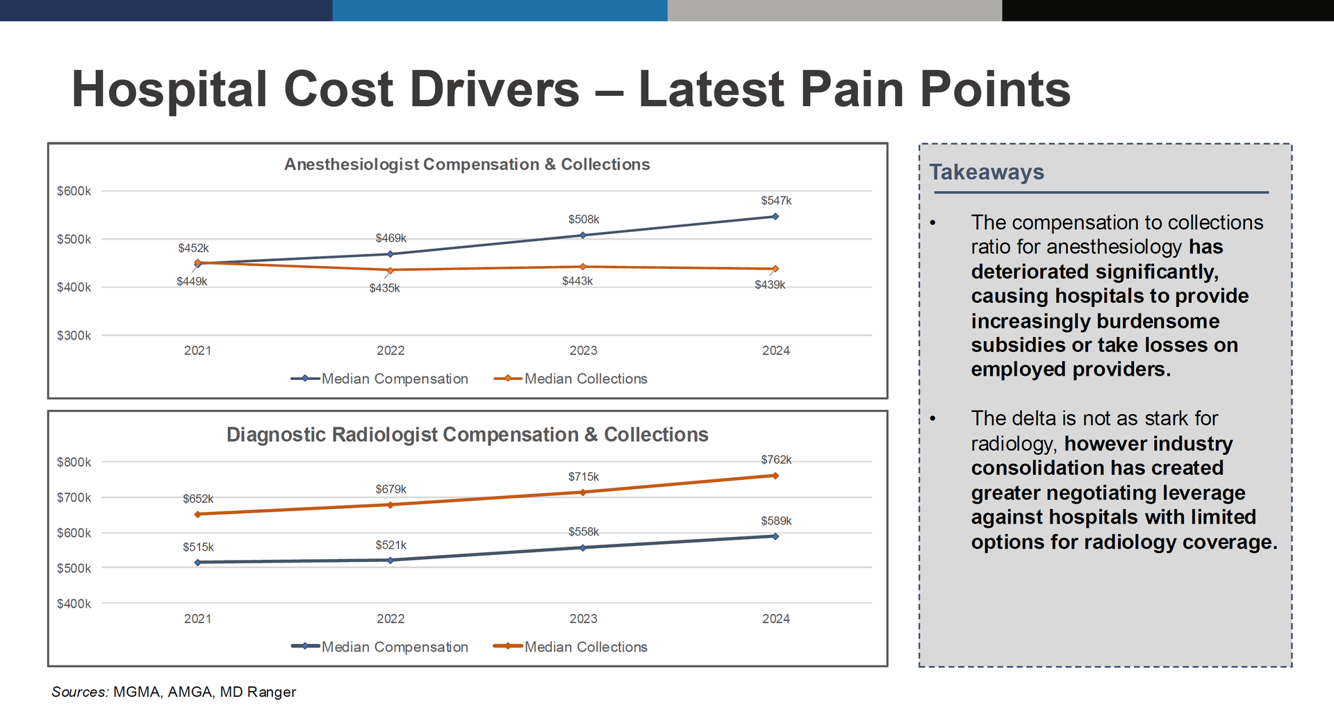 This generated some of the most spirited conversation. Herd walked through MGMA and AMGA data showing a widening gap between physician compensation and collections, particularly in anesthesiology, radiology, and hospital medicine. Anesthesiology data is the most dramatic. In 2021, median compensation and median collections were roughly even (both around $450K). By 2024, compensation climbed to $547K while collections dropped to $439K. That gap is showing up as hospitals writing increasingly large subsidy checks to keep their anesthesia groups in the building. |