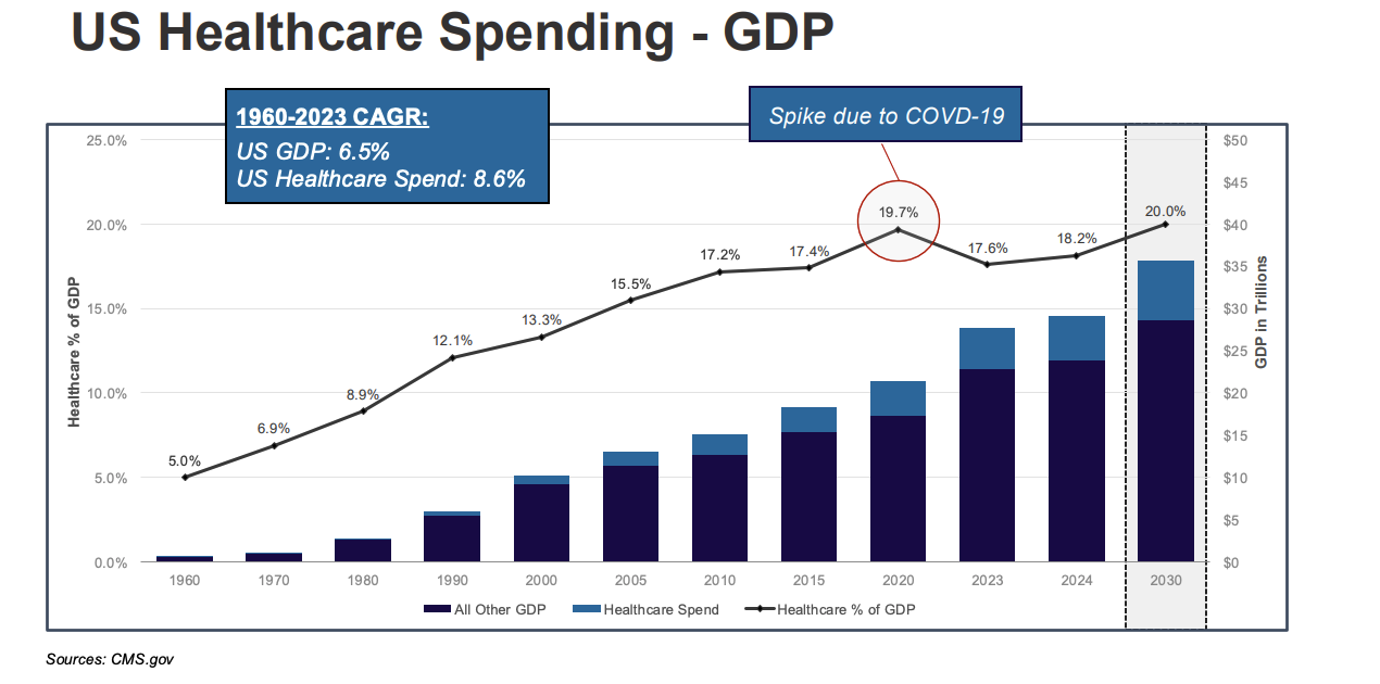 Healthcare spending is approaching 20% of GDP. We're at roughly $5.3T in total national health expenditures, and hospitals account for about $1.6T. The rate of increase flattened briefly post ACA (remember when the goal was to "bend the cost curve"?), spiked during COVID, came back down, and is now climbing again. |
