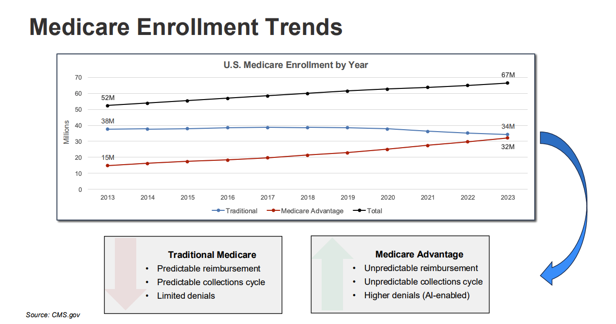 This matters enormously for operations. Traditional Medicare was predictable. You billed, they paid, collections were clean, denials were limited. MA operates like commercial managed care with pre auths, denials, and AI enabled claims management. Hospitals typically realize 85 to 90 cents on the Medicare dollar from MA plans, largely because of denial activity.