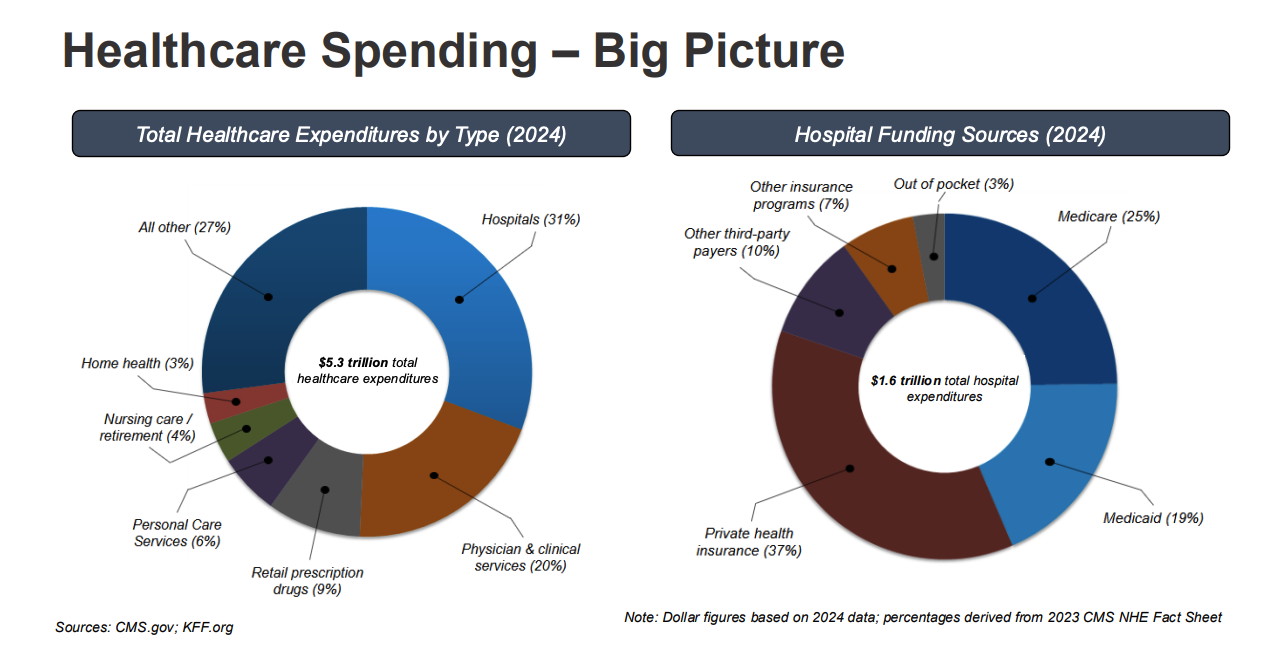 On hospital funding, the composition matters more than the total. Medicare and Medicaid together account for about 44% of hospital revenue. Private health insurance covers roughly 37%. And that 37% is where hospitals actually make their margin. |