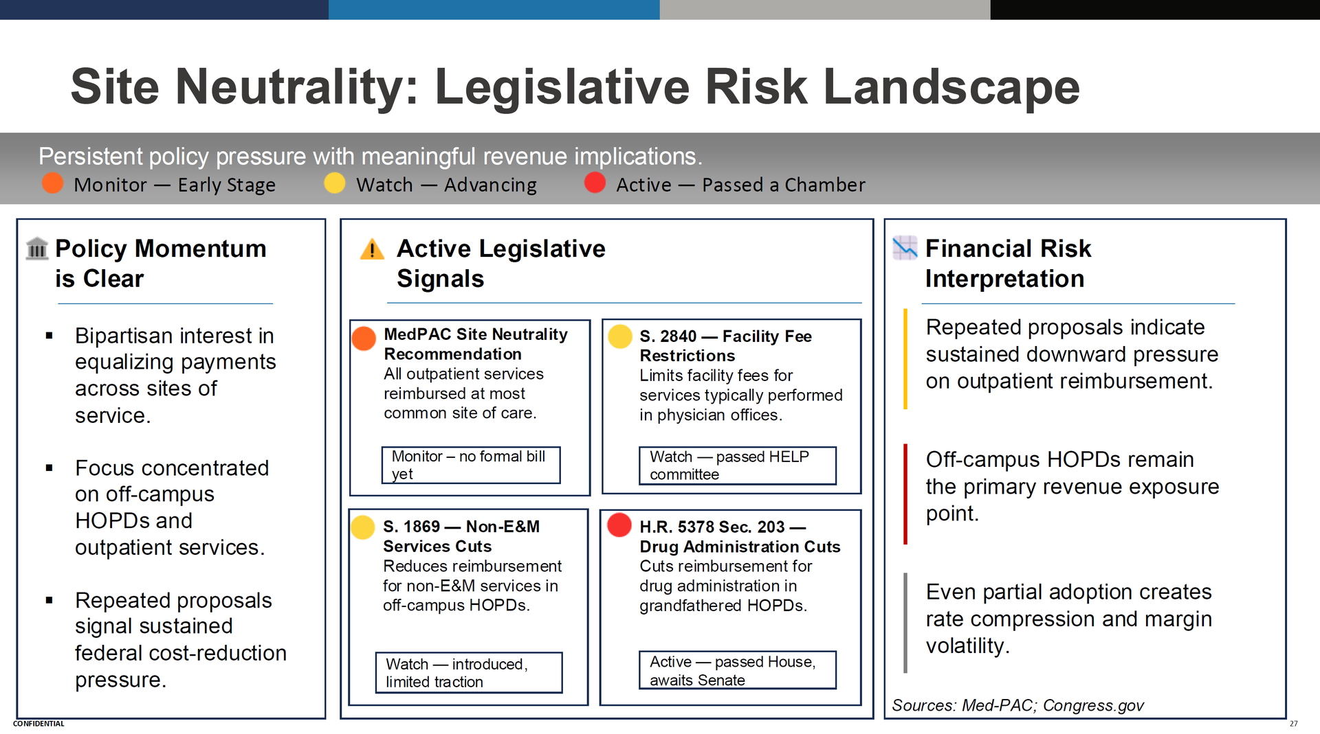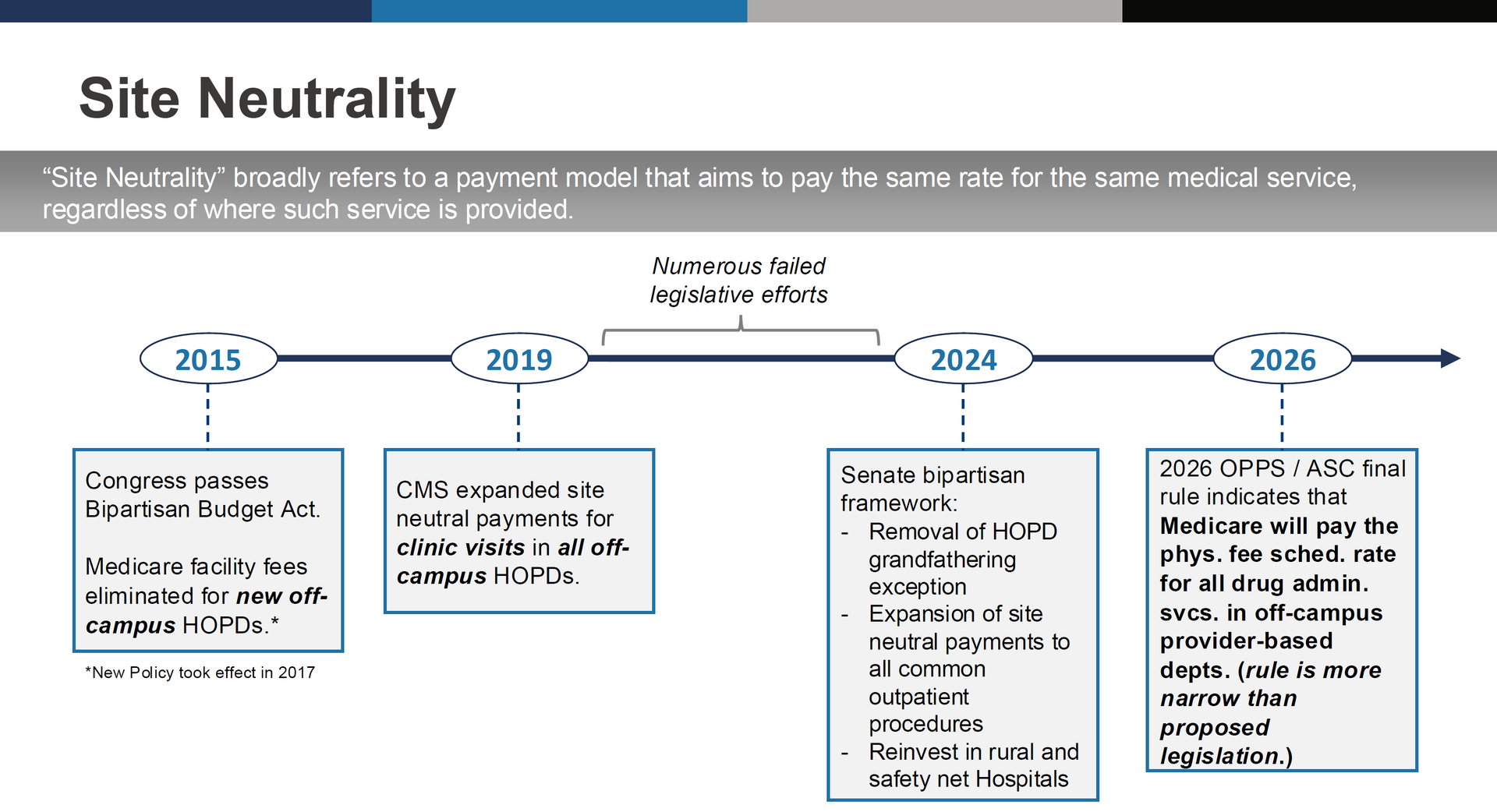 Site neutrality keeps inching forward. The 2026 OPPS final rule applied site neutral pricing to drug administration services in off campus provider based departments. S. 2840 (facility fee restrictions) passed the HELP committee. H.R. 5378 Section 203 (drug administration cuts) passed the House. MedPAC continues to recommend broader reforms. The direction of travel is clear even if the pace is slow. | On price transparency, Kyle made a point I think is exactly right: the data is not being used by consumers. Nobody is shopping for heart surgery based on a transparency file. But it is being used strategically in managed care negotiations. JTaylor uses price transparency data daily to help clients benchmark their commercial rates and negotiate contracts. Herd expects the data to improve over time and eventually create market level rate convergence, but we're probably five to ten years out from that having a direct impact. |