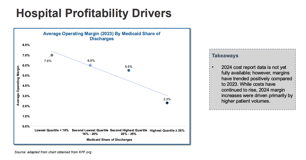 The One Big Beautiful Bill introduced several changes that could meaningfully shift hospital payor mix over the next decade. Shortened ACA enrollment windows. Tightened Medicaid eligibility verification and annual recertification requirements. Expiration of enhanced premium tax credits for exchange plans. CBO and KFF estimates suggest roughly 9M could lose ACA marketplace coverage, another 8M could lose Medicaid eligibility, for a gross coverage loss of about 16.5M. Some of those people move into employer coverage (estimated 6M offset), but the net effect is the uninsured population potentially growing from 27M today to 38M by 2034. For operators, the math is simple: more uninsured patients means more charity care and bad debt. The Medicaid changes hit safety net hospitals hardest. Herd's presentation data showed a clear inverse relationship between Medicaid share and operating margin. Hospitals in the lowest Medicaid quartile (under 16% of discharges) averaged 7% operating margin. Highest quartile (26%+) averaged 2.3%. Herd also flagged the OBBBA's cap on state directed payments, which currently allow states to require managed Medicaid plans to pay enhanced rates (typically 110 to 120% of Medicare). Post OBBBA, those payments get capped at 100% of Medicare starting around 2028. For hospitals in states that have been aggressive with SDPs, that's a real revenue hit. |