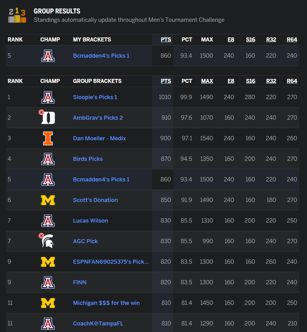 Hospitalogy bracket challenge update now that the final four is set! We have someone in the top 99.9% percentile of all brackets…see guys, I knew you were smart! Shout out to Sloopie, whoever you are you're incredible. But look at this…from the depths of below…a phoenix rises. I am 5th in the Hospitalogy bracket challenge, and in the top 93% tile of all brackets. Currently according to ESPN's prediction, Dan Moeller with Medix is projected to win the challenge IF Illinois takes it home. For me to win, I need UConn and Arizona to make the title game. Let's gooooo. |