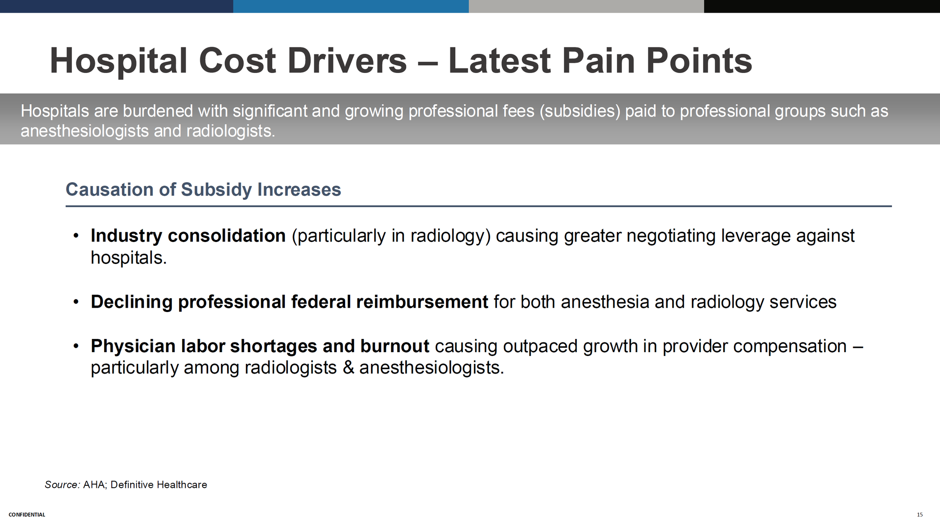 There are a few different drivers of professional fees inflation: industry consolidation (especially radiology) giving groups more negotiating leverage against hospitals, declining Medicare professional reimbursement, and physician labor shortages pushing up compensation. Kyle noted it takes roughly 2.2 new physicians to replace the productivity of a single retiring veteran, which compounds the workforce pressure.