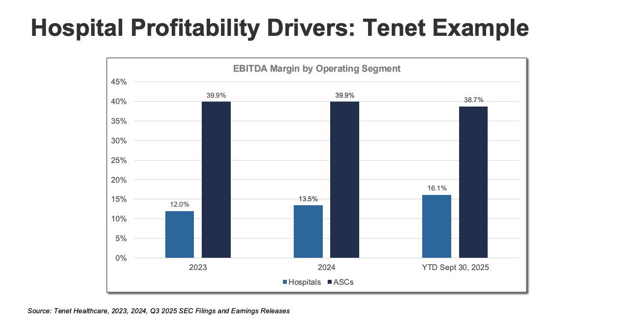 One of the meatiest parts of the discussion. Herd walked through what he called the "perfect storm" driving volume out of hospitals and into ASCs. Payors like ASCs because they're roughly 40% cheaper. Technology allows higher acuity procedures in outpatient settings. Patients prefer the convenience. And CMS added 547 new procedures to the ASC Covered Procedure List in 2026 alone. Advisory Board data projects outpatient volume growth of 10% over the next four years and nearly 19% over the next decade, while inpatient volume stays essentially flat. On a net basis, over 1,000 new Medicare certified ASCs were added between 2019 and 2024 (roughly 7,500 to 8,500). The major platforms are all scaling aggressively: USPI at ~530, SCA Health at ~320, AMSURG at ~250, HCA at ~125, Surgery Partners at ~150. Some estimates suggest up to $50B in hospital volumes could migrate to freestanding platforms. Herd and Kyle's point was that the systems doing well financially all have well thought out ambulatory strategies. They're keeping margin within the system by investing in ASCs, freestanding EDs, and urgent care. The ones struggling haven't built those capabilities and are watching volume walk out the door. Kyle added important nuance on regulation. In non CON states like Texas, you want to build an ASC, go build one. Capital markets sort out whether it succeeds. In traditional CON states, the hospital lobby still exercises significant influence. The pace of ASC expansion varies enormously by geography. Tenet is the public company case study. Their USPI segment runs roughly 39% EBITDA margins versus 12 to 16% on the hospital side. The strategic logic of pivoting toward ambulatory is pretty hard to argue with when the margin differential is that stark. |